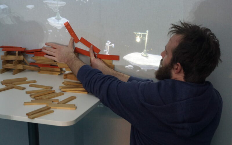 L’allumeur de réverbères est une installation vidéoludique en réalité mixte qui invite à aider un petit personnage à illuminer sa ville en construisant physiquement des ponts et plateformes entre des îles flottantes. Cette œuvre hybride mêle jeu vidéo et interaction réelle, où les actions des joueurs influencent directement l’univers projeté, créant une expérience à la fois poétique et participative.