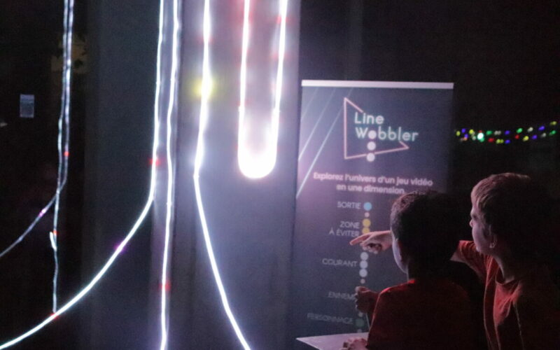 Line Wobbler est un jeu d’aventure placé sur un long fil de points lumineux, des LEDs. À l’aide d’un joystick souple, le joueur doit faire avancer son personnage, une des LEDs, dans un monde filaire en 1 dimension.
