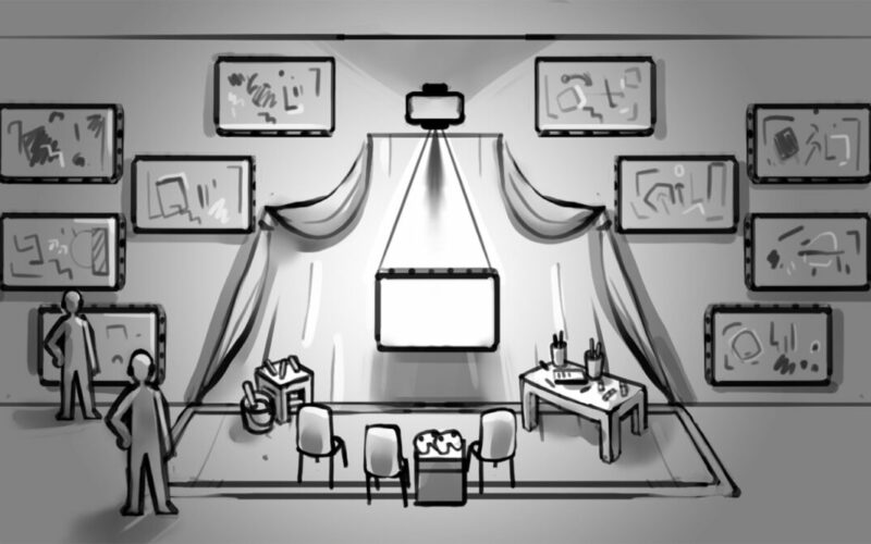 Tableau Rétro-Art : Empreinte ludique est une installation d’art immersif où le public est directement impliqué dans la finalité de l’œuvre. C’est un jeu vidéo, pour 4 à 8 participants simultanés, projeté sur une toile vierge à côté de laquelle est mis à disposition du matériel graphique pour dessiner. Jouez sur un parcours partiellement invisible et dessinez-le à même l’écran de jeu pour vous guider dans la partie. Laissez-vous des indications, des annotations. Votre empreinte de jeu créera un tableau, l’interprétation graphique de la composition d’un autre, qui deviendra la vôtre.